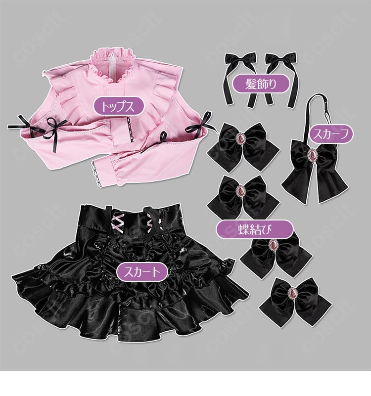 胸元やウエストまわりの蝶結びが、彼方らしい可愛さとアイドル衣装らしい華やかさを引き立てます。